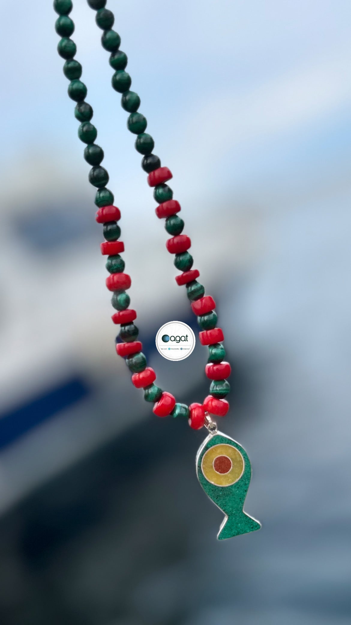 Her detayı özenle seçilmiş doğal taşlarla hayat bulan bu özel kolye; Malahit’in derin yeşili, Mercan’ın sıcak kırmızısı ve Kehribar’ın altın tonlarıyla ruhunuza doğanın enerjisini taşıyor. Balık formundaki mozaik tasarım ise hem zarafeti hem de anlamı bir araya getiriyor; bolluk, bereket ve sezgisel gücü simgeliyor.