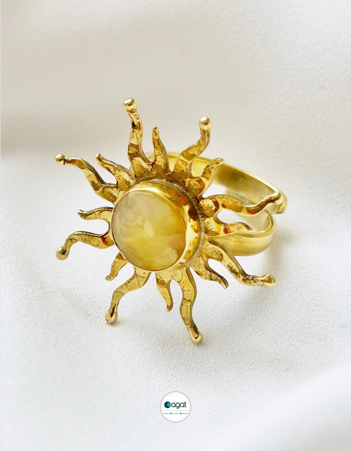 Sıcacık enerjisi ve doğal güzelliğiyle öne çıkan kehribar taşı, hayatın kaynağı olan güneş motifiyle birleşerek bu özel gümüş yüzükte hayat buluyor. Ruhunuza ışık, stilinize zarafet katacak eşsiz bir tasarım.