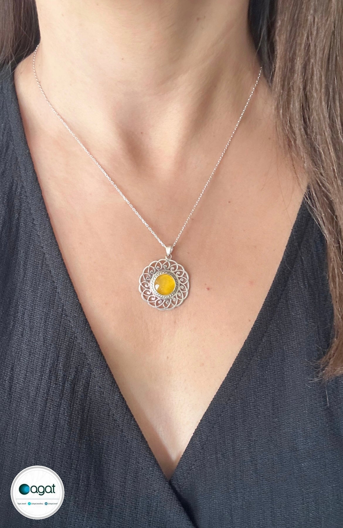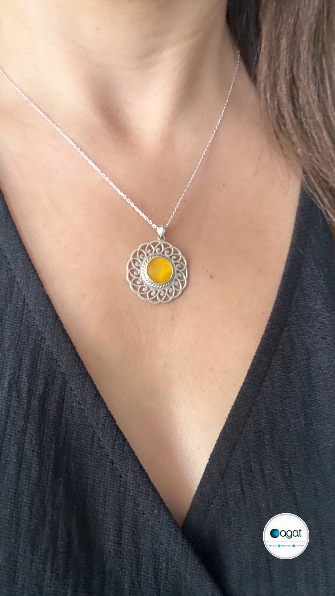 Kehribarın pozitif enerjisi, stresi azaltma ve bedeni dengeleme özellikleriyle bilinir. 925 ayar gümüşün zarif ışıltısı ise bu doğal taşın enerjisini estetikle tamamlıyor. Bu tasarım sadece bir takı değil; ruhunuza dokunan bir parça, size iyi gelecek bir detaydır.