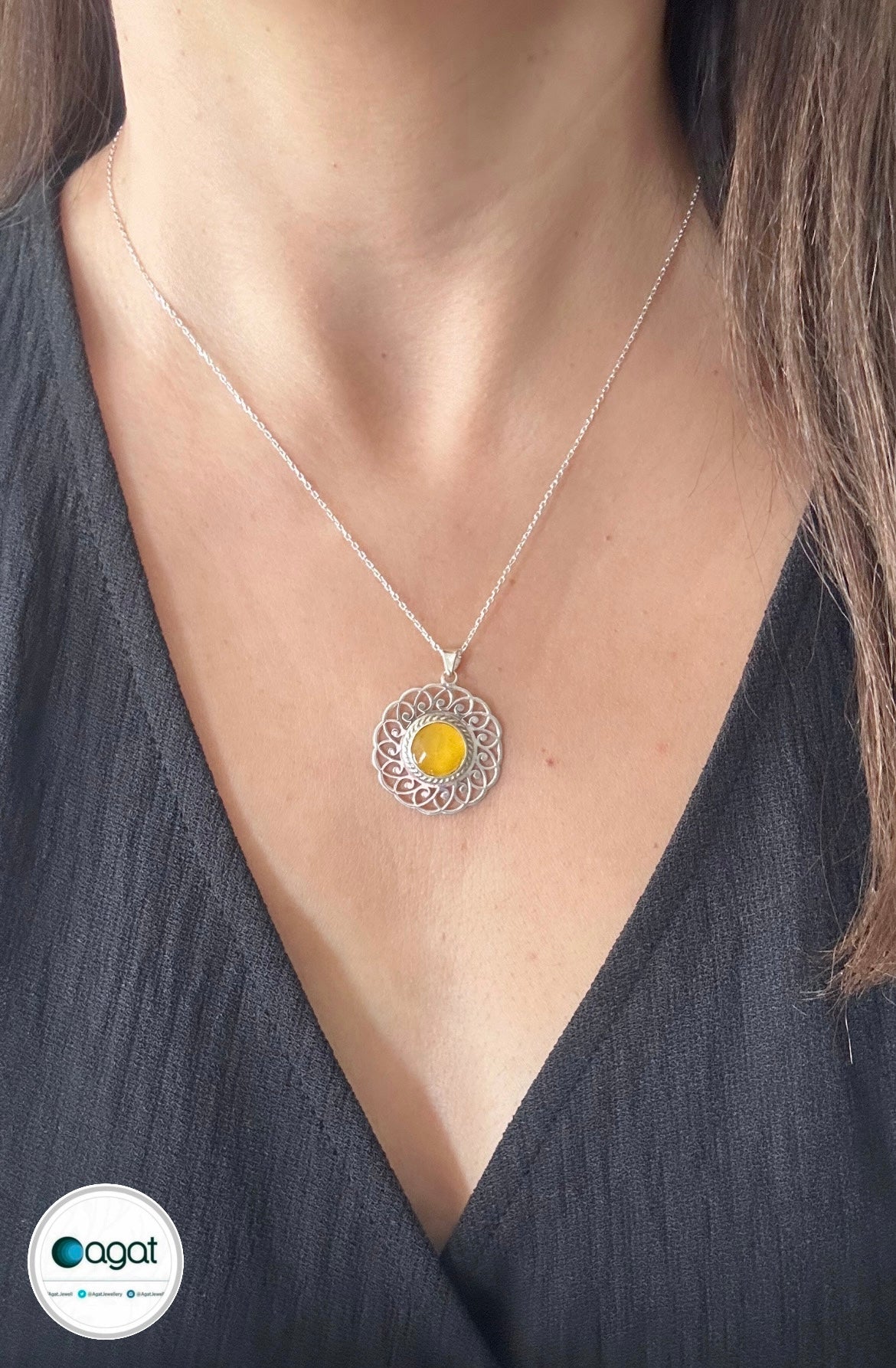 Zamana meydan okuyan doğallığı ve şifalı enerjisiyle Kehribar, bu özel tasarım kolyede yeniden hayat buluyor. Binlerce yıllık geçmişiyle hem estetik hem de spiritüel bir değer taşıyan Kehribar, sıcak tonları ve ışığı yansıtan dokusuyla boynunuzda adeta bir sanat eseri gibi duruyor.
