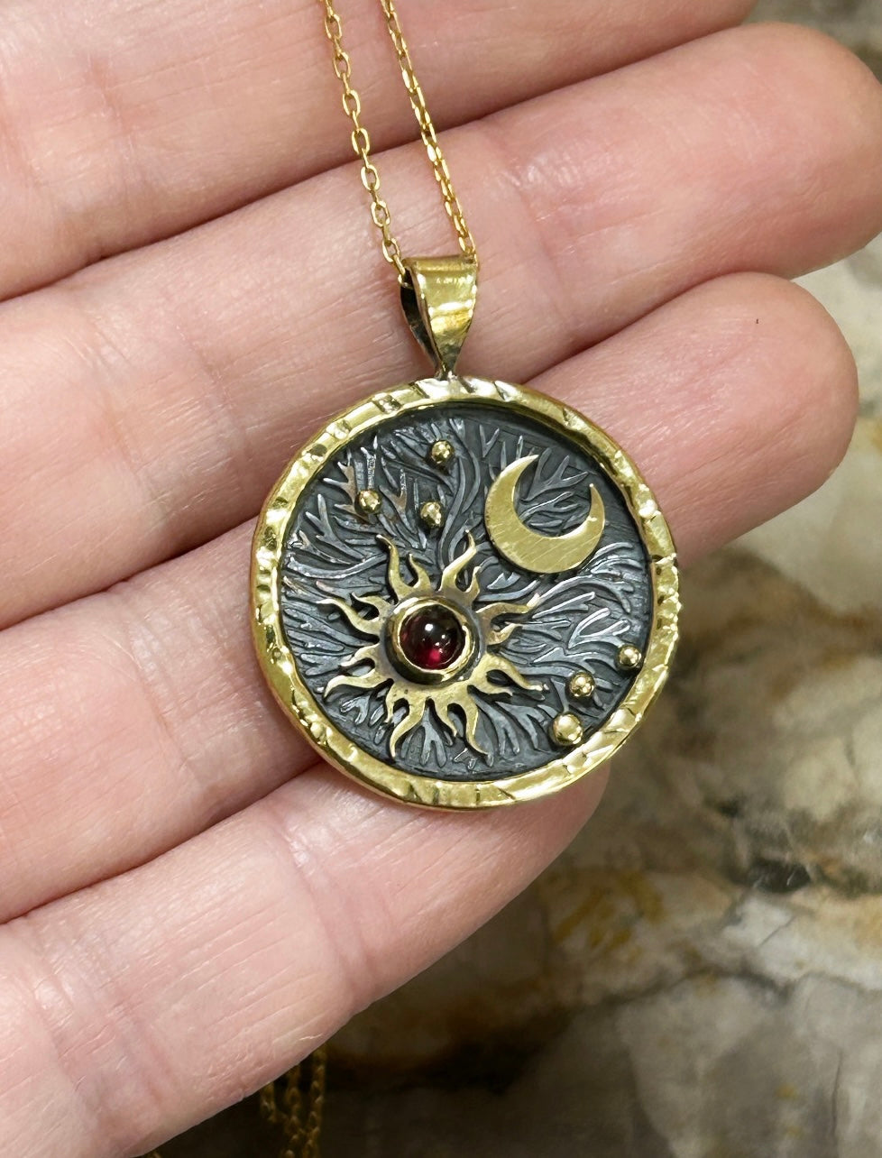 Lal taşı Güneş & Ay antik kolye